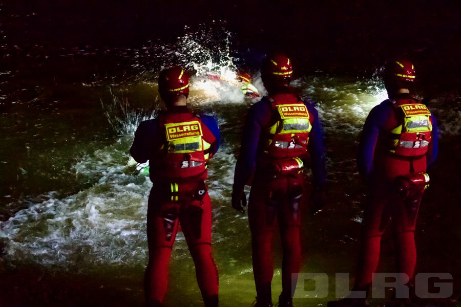 Treffpunkt war die neue DLRG-Einsatzwache in Sigmaringen. Nach einer kurzen Einweisung teilten sich die Einsatzkräfte in zwei Gruppen auf: Strömungsretter und Bootsführer. Während die Boote am Fuße des Hohenzollernschlosses zu Wasser gelassen wurden, rüsteten sich die Strömungsretter mit Neoprenanzügen, Prallschutzwesten und Wurfsäcken aus.