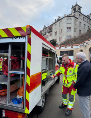 Dominik Herzog, 2. Vorsitzender der DLRG-Ortsgruppe Sigmaringen, stellte den anwesenden Gästen die Aufgaben des DLRG-Rettungsdienstes vor. Dabei machte er deutlich, dass die Ortsgruppe trotz großer Einsatzbereitschaft vor einigen Herausforderungen steht. Dazu gehören unter anderem fehlende Wasserflächen für die Ausbildung, ein erheblicher finanzieller Aufwand für Einsatzmaterial sowie der Wunsch nach einer rechtlichen Gleichstellung der DLRG-Einsätze mit denen anderer Organisationen der Blaulichtfamilie.